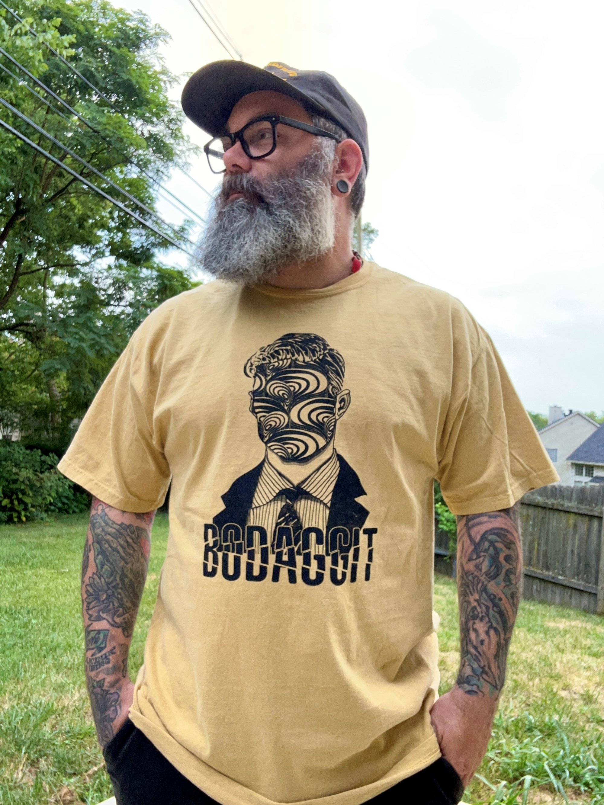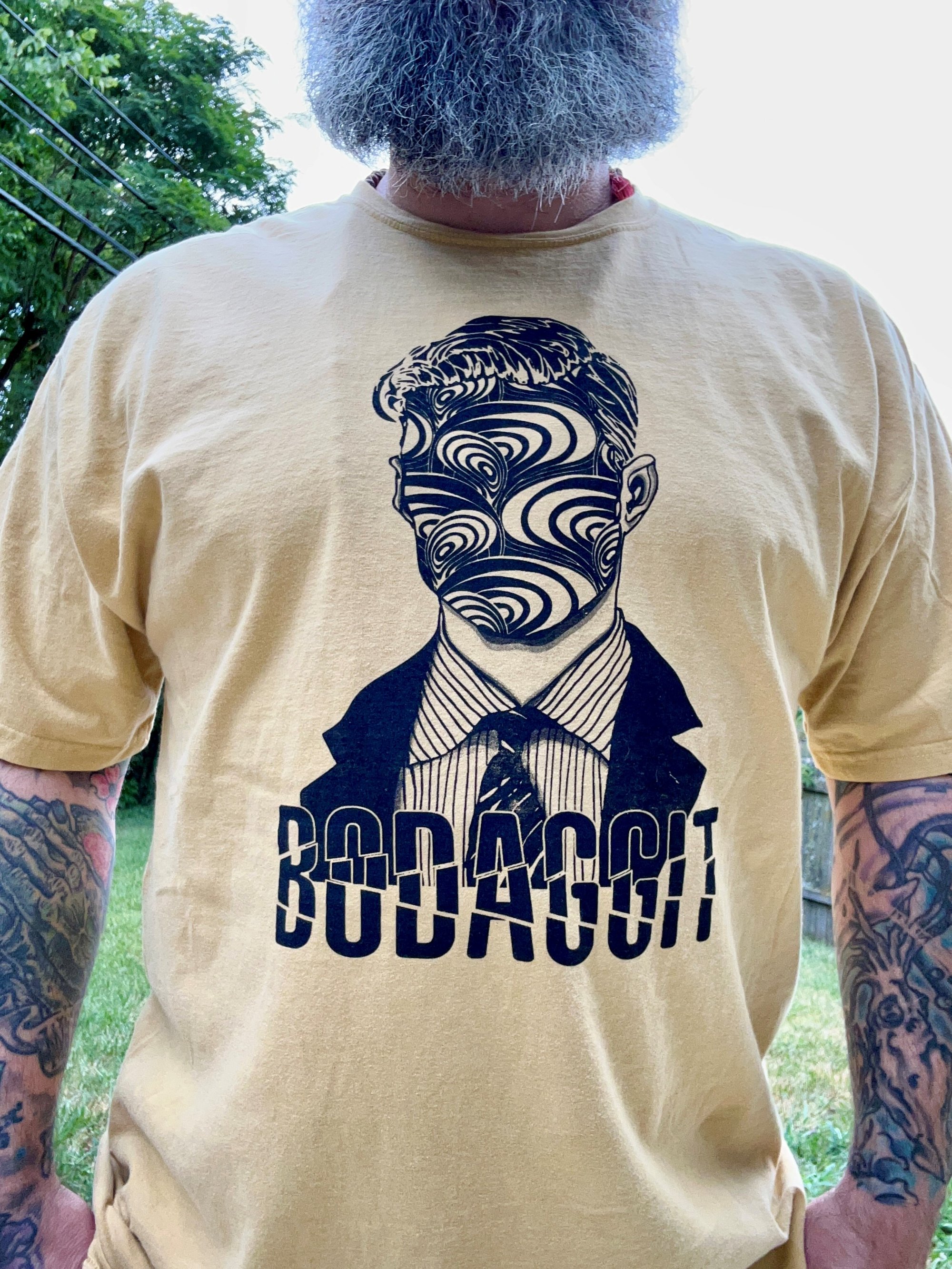 Support BODAGGIT with this butterscotch All Business tee exclusively available through Transcendental Revolution! Limited quantities available.