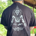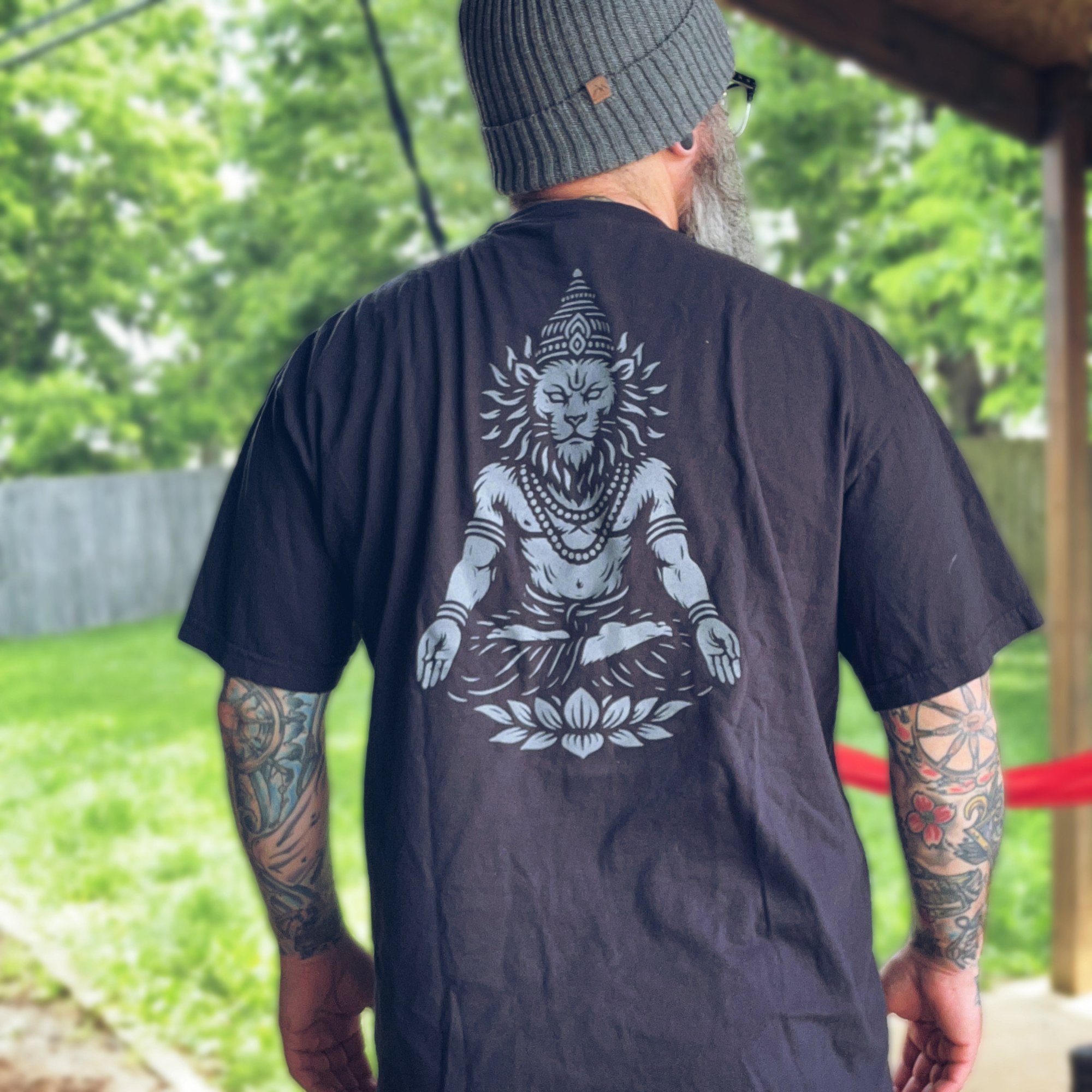 This tee proudly displays Lord Nrsimhadeva on the back. Nrsimhadeva is a powerful & merciful incarnation of the Supreme Personality of Godhead, Lord Krishna, appearing in a half-man, half-lion form.